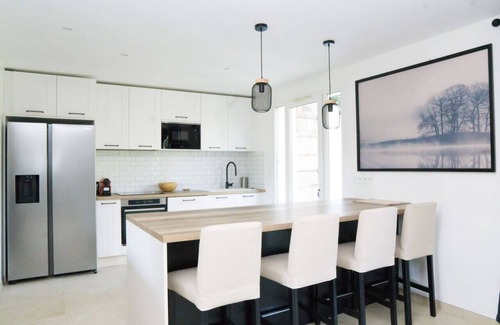 ★ 1 open kitchen with a central island and all the necessary appliances including a large American fridge.