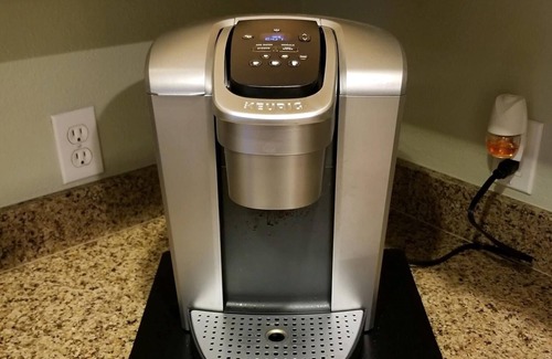 > Keurig coffee maker with a starter pack of coffee pods, assorted teas, sugar & creamer.