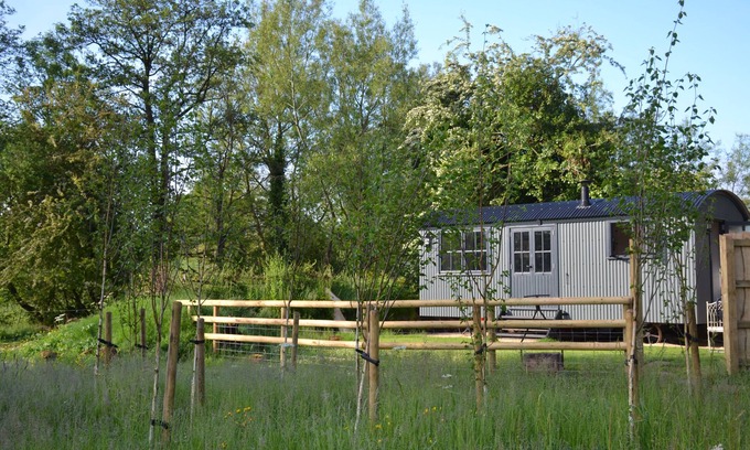 This really special Bye Mills Shepherd's Hut has luxury and your comfort in mind. Sitting in a beautiful riverside wildflower paddock, the hut has an outside bothy with sofa and chair for a unique chill out space, a private hot tub, barbq and a secluded deck to watch the sunset from.
