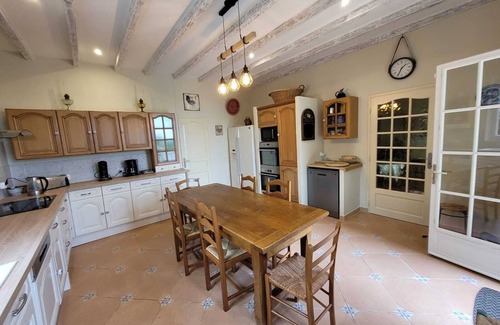 Outside facilities: On the spot: the heated swimming pool (11m x 5.35m) with a large surrounding terrace, and equipped with an immersion alarm for the safety of small children; the billiard room is always available, also an organ and a guitar; the mature garden makes for peaceful relaxation. In a new renovated building (120m²), there is a large Jacuzzi for 5 people (2 lying & 3 sitting), a sauna, a balneo shower and fitness equipment. A shaded 12m x 4m pétanque court is available for competitions with friends. There is a children's area with swings, ping-pong, bikes, snooker, table football, volley-ball, darts; Complete garden furniture, a large barbecue, sun lounger’s, several covered or open air terraces around the house and a parking area.