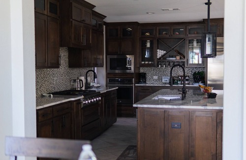 Modern home with beautiful architecture. High ceilings and big rooms. Living areas have plenty of space for everyone. Theater room great for movies or binge watching with state of the art sound system. Kick back and listen to some music while you make breakfast or dinner in the living room with the same sound system! Weather it’s a event or a short with family this home is perfect for both.