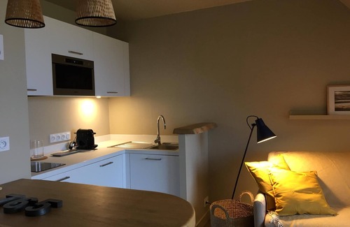 large new studio sea view full south center bourg is located in Saint-Guenole. large new studio sea view full south center bourg provides accommodation, featuring Fireplace/Heating, Internet, Kitchen, among other amenities. This Apartment features Fireplace/Heating, Internet, Kitchen, to make your stay a comfortable one.