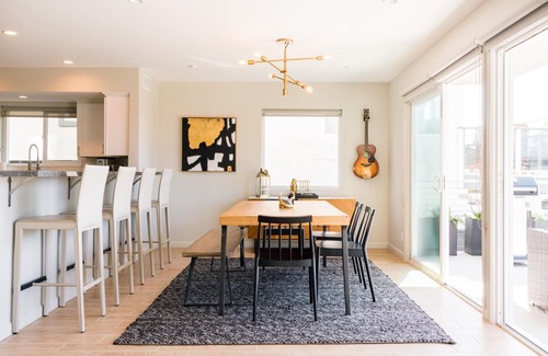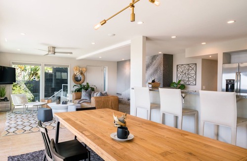 Grandview Lofts, a pristine coastal complex near Grandview Beach in Encinitas, CA. The SeaLoft unit on the ground floor has partial ocean views. This 1400 SF designer condo offers two King Suites and a Queen Murphy bed, sleeping 5 adults comfortably. Enjoy partial ocean and sunset views from its open-concept living area and expansive balcony. Just a two-minute walk to the beach, it epitomizes stylish, comfortable indoor/outdoor living.