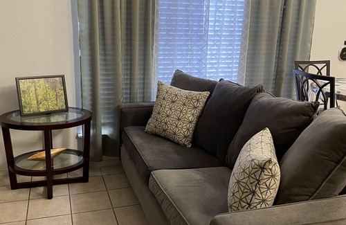 Welcome to this serene and spacious back apartment in San Antonio, Texas. The property consists of three units: the back apartment, a front house, and a studio apartment, all intended to accommodate guests. The back apartment features two bedrooms, each equipped with smart TVs for your entertainment. Additionally, there is a full bathroom and a standalone shower in the master bedroom. For extra sleeping space, there's a cozy sofa bed in the living area. Stay connected with the wireless high-speed internet, and unwind on the beautiful deck furnished with lawn chairs, a table, and an umbrella - ideal for relaxation. Please note that the barbecue grill will be available for use only if other guests do not require it. We are conveniently located near Lackland AFB, UTSA, Six Flags, SeaWorld, the airport, the Shops at La Cantera, Downtown San Antonio Riverwalk, and the Medical Center. As a token of our appreciation, we offer discounts to active military personnel. Come and find respite in this tranquil retreat.