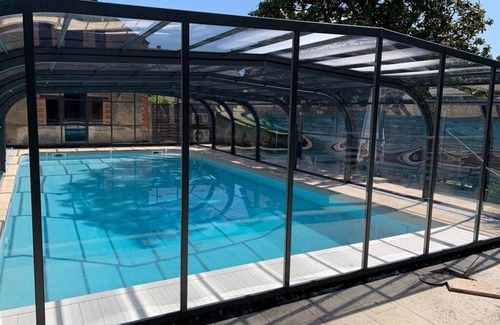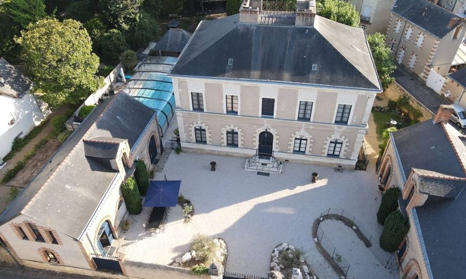 The rental is located in a wine-producing village on the Layon hillsides, in the Anjou Val de Loire region. It is installed in two outbuildings renovated in the rules of the art, by combining modern comfort and charm of the former. They are separated by a large courtyard. They surround the owners' house. In the village, you will find all the services and many shops. The decoration has been designed with furniture found in antique shops and second-hand shops. The dining room, kitchen and a small living room are located in an outbuilding on the ground floor, covering an area of 70 m². On the first floor, there is a billiard room with a lounge and 1 bedroom with bathroom. In the second outbuilding, opposite the first, are the 4 bedrooms. These 4 rooms are equipped with a bathroom with Italian shower or traditional shower with a 90 cm basin for your comfort. All the beds are equipped with Tempur mattresses, a very high standard of comfort. All rooms are air-conditioned. The large swimming pool is secure (13 m x 6 m). The pool terrace is equipped with many sun loungers. The atmosphere is Mediterranean with olive trees, palm trees and southern plants. You can enjoy the 900 m2 park with its century-old trees and rare species for a walk, for reading, for a picnic, for dreaming. Near the kitchen and the dining room, you will have your meals outside thanks to the garden furniture at your disposal, protected from the sun by a large parasol if necessary. You can grill on the Weber charcoal barbecue. A small private courtyard opposite one of the ground floor bedrooms is also available. Thouarcé is a village in which you will find all the services and shops you need for your stay within walking distance: bakeries, delicatessen, café-tabac, hairdresser, beauty salon, supermarket, petrol station, banks, cash machines, garages, etc. Don't forget the health services: doctors, pharmacy, dentists, physiotherapists, nurses, chiropodists and security services: gendarmerie, fire brigade, all nearby.