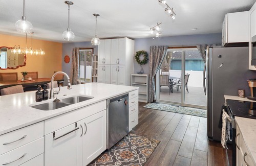 This beautiful ranch four-bedroom house lets you easily enjoy all the spaces it offers on the main floor. You will find a 4 bedroom, 2 full bathrooms and a half bath, a fully-stocked kitchen, a laundry room (located downstairs), a fully-fenced outdoor space, a deck, and a Weber grill. The ranch makes it easy to fulfill your every need, from entertaining a group together, to business and work-related travel or a family getaway. The open-concept floor plan allows you to have flexibility to use the kitchen dining room and living room as 1 space great for entertaining guests. The Ranch gives you the best of both worlds. If you are in the mood to be in a more closed-off living room, the Family room located either by coming in the garage entrance or off the kitchen is the place to go this is a great place to go when wanting to get cozy and watch a movie! It also has a desk, perfect for a quieter, and less distracting area. The half bath is located off the family room as well.