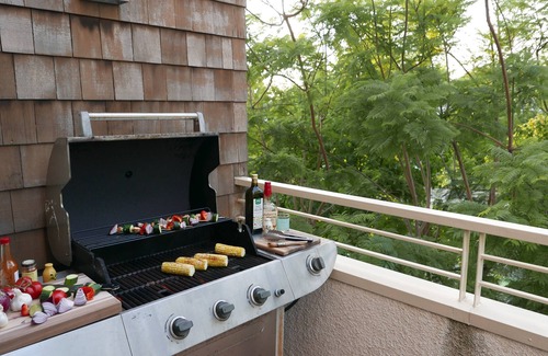Very private corner unit with vaulted ceilings and an ocean view from a very large furnished rooftop patio - the best place to soak in the sun while reading a book or surfing the web. It is also lit for evening enjoyment as well. A lovely place to enjoy smores over the firepit. The lower terrace is complete with grill for year-round cookouts in the lovely Santa Monica climate.