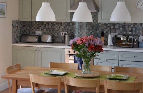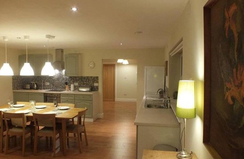 Open plan kitchen/dining/living area - very large, bright and family friendly with wooden flooring. A fantastic space for cooking, playing, relaxing and being together. Three double patio doors lead to decking area and enclosed lawn garden with seasonal flower beds. Informal snug area with arm chairs and large leather couch. LCD T.V, DVD player, digital radio. Dining area with dining table to seat 8 and kitchen with all mod cons.