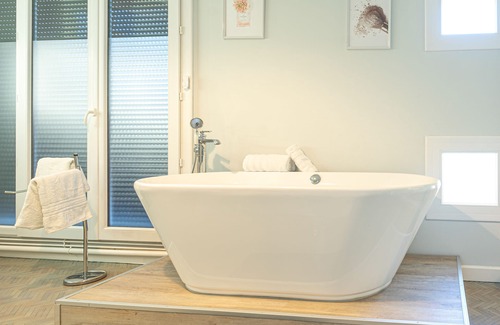 Upstairs, three large bedrooms offer privacy and comfort to all occupants. Each room is equipped with a double bed (140x190), except for one bedroom which features a queen-size bed (160x190). You'll also find a bathroom with shower and a large bathtub, as well as a separate toilet with a sink for added convenience. A dressing room is also at your disposal to store your personal belongings with care.