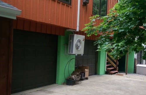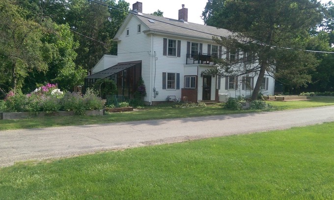 Apartment above garage with private deck. Completely remodeled 2016. Has complete kitchen, bathroom has large tub and shower with a cedar lined closet and a small dressing table. The whole apartment is open with large windows including a bay window in the kitchen area. There are 3 twin beds and a double bed. An air mattress can be made available. We have added solar panels in 2021 to reduce carbon footprint.