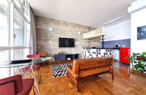 Large retro-style studio with a beautiful view of São Paulo in one of the most iconic buildings in Brazil, the Copan Building. Stay and enjoy one of the greatest postcards in Sampa. Designed by Oscar Niemeyer in the 1950s, Copan continues to be one of the largest reinforced concrete works in our country.