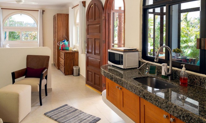 On a quiet back street just 2 blocks from the beach and a pleasant 15 minute walk to the town square. Lovely large studio apartment with a king bed and a half wall and closet separating the bedroom from the living room and kitchen area. Sofa bed for a third guest if needed. Well-equipped kitchen with granite countertop and full-size fridge. Property shared with 3 other units; a smaller studio on the ground floor, a 2 bedroom on the second floor, and a large studio on the third floor. Rent the whole property for your family gathering. Your unit has a private, screened-in porch. Located right next to the Abbey del Sol property with the central office is located. The office is open every day from 8am to 5pm to help with anything you need. Base rate for 2 people. Extra person per night $30 USD. Non smoking only.