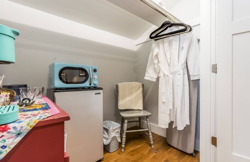 Located three miles from Bowdoin College and 10 minutes to Bath, this large new-build offers a second floor 360 sq ft bed room with King size bed and roomy sitting area with a TV. There is a large bathroom with tub and shower and a 110 sq ft “landing library” for a comfortable spot to read and relax. The space also has a coffee bar, microwave, and refrigerator. We even include bathrobes.
