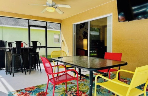 The full kitchen boasts many appliances (Dishwasher, Stove, Microwave, Coffee Maker, Keurig, Disney Waffle Maker, Disney Toaster) and beautiful, spacious and fully stocked cabinetry. A large refrigerator provides plenty of space and provides an ice maker and water. There is plenty of room for your food items as we have a full pantry. Plenty of place settings, silverware, and glassware provide every guest what they need. The space is very well equipped for our guests with a large table for 8 guests. The room extends into a second living room with a large couch, giant chair and comfy swivel. Enjoy a show on the smart TV while a giant mural of your favorite mouse joins you. Sliding glass doors provide a natural transition to the spacious and easily accessible patio.