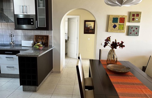 Spacious and luxurious two-bedroom holiday apartment, with two bathrooms, terrace of 42 m2 with magnificent views of the beach of Jandia and its famous lighthouse, very sunny and with all the necessary amenities to enjoy a magnificent holiday, just 350 m away from the beach, and very close to the leisure and shopping area. The terrace is fully furnished, and from the bed of the double bedroom, you can observe the beach without having to get up. The apartment is very comfortable, has an interior surface of 72 m2, and consists of two bedrooms, two bathrooms (one of them in the master bedroom, with bath-shower, Wc, two sinks and bidet), the other bathroom, with a shower, a sink, toilet and bidet. Living room with TV, stereo, and a fully equipped kitchen with everything you need (coffee machine, toaster, kettle, blender, oven, microwave, cutting board, dishes of all kinds, dishwasher, etc.)