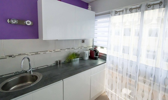 The modern and equipped kitchen opens onto a warm living room with a TV and a box (fiber / wifi). Separate sleeping area with comfortable double bed. The bathroom has a bathtub.