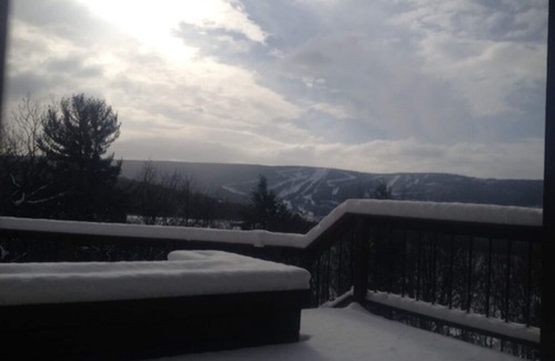 Large home on wooded 2 acres with the view of Blue Mountain Ski Area. This home sleeps up to10 people, ( 3 bedrooms, loft with futon and full size bed and basement with pull out sofa bed.) full kitchen, laundry room, dining room, living room, 2 1/2 baths, large deck with grill, pool table, foosball, and hot tub. Enjoy the hot tub and large deck with grill and view of blue mountain ski area. Or just hang in the basement and play pool. Grocery store 6.6 miles away. Fitness room to work out... 1 mile from skiing or hiking and less then 30 minutes from the unique town of Jim Thorpe, Beltzville Lake and the Lehigh Valley Mall.