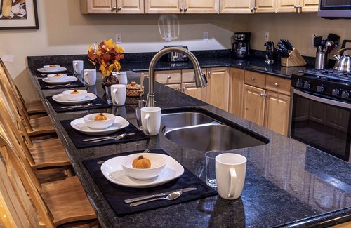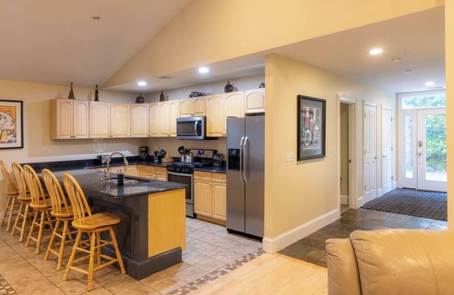 The living, dining and kitchen all share a large and gorgeous room with vaulted ceilings. There is an expansive wet-bar and a well furnished kitchen to make your stay very comfortable. The Very Large high definition TV with surround sound will keep the movie buffs very content. There is also a pool table area to relax or chat with friends.