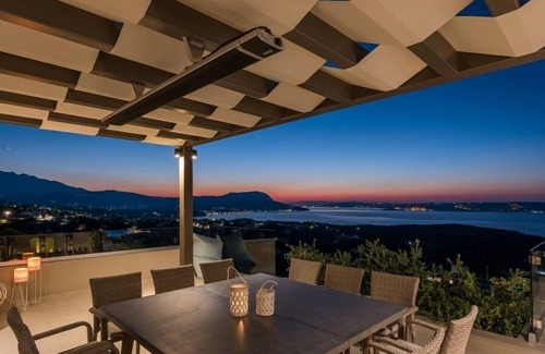 With breathtaking sunset views over the bay of Chania, Villa Oceanus is a brand new stunning villa that provides the ultimate retreat for relaxation and luxury. Perched up on a hill, but just 800 meters from the Cretan coast, the villa is located in a beautiful area, full of sleepy traditional Greek villages, and just a few minutes away from lovely sandy beaches and hidden coves.The villa comfortably sleeps up to 12 guests and features five double bedrooms, four bathrooms, a cinema/conference room/bedroom (with double sofa bed), large heated infinity swimming pool, and fantastic outdoor dining and BBQ area. Combined with multiple balconies and terraces, which were designed to be both private and also showcase the fantastic views, the villa also boasts a spacious open-plan kitchen, dining and lounge area inside the villa. Superbly designed and furnished, this villa offers families and groups a 5-star experience and is the perfect base when visiting the wonderful area of Western Crete. Set on two floors, the villa has been designed to take advantage of the magnificent scenery and the thoughtful layout offers superb views from the bedrooms and living areas. The upper floor and main entrance area to the house features four bedrooms with large balconies. The lower floor features a further bedroom, cinema room, a spacious open plan living area and access to the swimming pool and outdoor dining and terraces.Visit some of the most beautiful beaches in the world or simply relax at the villa and enjoy it’s amazing views over the sea and mountains. Villa Oceanus is only a 45-minute drive from the international airport of Chania and the historic Venetian city of Chania, known as \'little Venice\'. Within a couple of minutes walk of the villa there is a shop, coffee shop, bar, and two restaurants in nearby Kokkino Chorio village. Plaka village is a 5-minute drive where you can find supermarkets and numerous restaurants and bars offering local and international cuisine.UPPER FLOOR:Bedroom 1 - A large (18 m2) master bedroom with king bed, ensuite shower room and freestanding oval designer bathtub. This room has access to both shared and private balconies through large sliding terrace windows.Bedroom 2 - A 16 m2 bedroom with king bed (2 twins on request), ensuite shower room and private balcony.Bedroom 3 - A 16 m2 bedroom with king (2 twins on request) and access to a balcony. Shared bathrooms with bedroom 4.Bedroom 4 - A 16 m2 bedroom with 2 double beds and access to a private balcony. Shared bathroom with bedroom 3.LOWER FLOOR: A staircase leads down to the main living area and swimming pool level. The spacious interior features a further double bedroom with sofa bed, cinema room, and open-plan kitchen/living area and a guest toilet/shower room (also accessible from the pool area). Bedroom 5 - A 15 m2 bedroom with king, an ensuite shower room and access to the pool and terrace area. The living area overlooks the pool and views across the bay and features spacious seating areas, a TV with satellite channels, and a large dining table. The open-plan Italian luxury kitchen is fully-equipped with built-in oven, hob, fridge/freezer, dishwasher, juicer, coffee maker, blender, Nespresso machine, and central island with high stools. Two side rooms next to the main kitchen also have further storage cupboards, a microwave, oversized fridge/freezer, sink, washing machine & dryer, drying rack, and ironing board & iron. A large cinema room is located off the main living area. This is designed to be a multipurpose area. It can be used as a cinema room, conference room or can easily be converted to an extra sleeping area with 2 double sofa beds. This room is equipped with a large, 75 inch, flat screen TV, Netflix, PlayStation 4, Amazon Prime, Satellite TV and a wireless printer.POOL AREA: The ground floor accesses the pool, terrace areas, and outdoor dining areas. The 40 m2 swimming pool has a stunning infinity feature where the water cascades over the end of the pool. It features beautiful non-slip mosaic tiles, has a shallow children’s area, and a poolside shower. There is an option for the pool to be heated on request (at additional cost).The very large beautiful outdoor living space includes luxury sunbeds and designer lounge chairs available for the use of guests. A full outdoor dining area and kitchen is situated next to the pool. It has a charcoal BBQ, sink and fridge. A large dining table has covered pergola for shade and a heater if required.VILLA FEATURES: