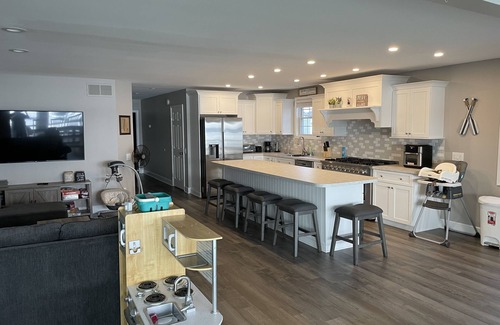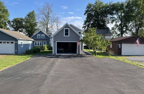 This house is perfect for families who want to relax or entertain! It has it all! This newly renovated home is right on the water at the North end of Conesus lake. It has a detached garage with game room including basketball, foosball, darts, shuffleboard, poker table and more. Walking distance to Vitale park, gas station, liquor store, and multiple restaurants! The main level has an open floor plan with full view of the lake and a large dining room table to accommodate your whole group.