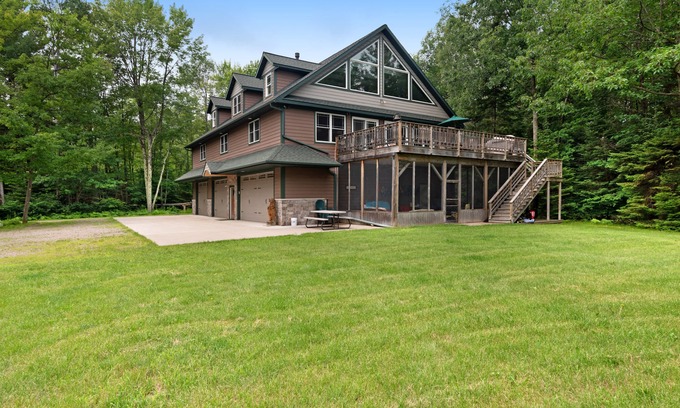 Experience Northwoods camping in first-class comfort at this gorgeous, lakefront home in Tomahawk, offering plenty of outdoor entertainment for the whole family to enjoy! This home has a lakeside area with a boat dock, a large grassy yard with a firepit, and a spacious, furnished deck with a screened patio. Curl up with your favorite novel alongside the gas fireplace, prepare meals out on the gas grill, and round out the day with a movie or favorite series on the flatscreen TV.