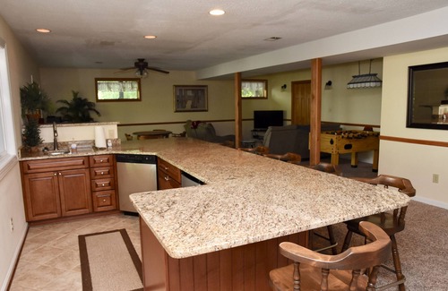- Huge bar and entertainment area downstairs, including foosball table, pool table, and TV area