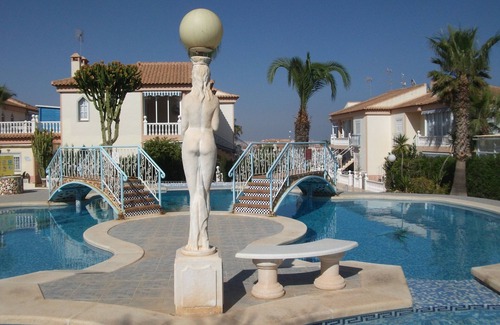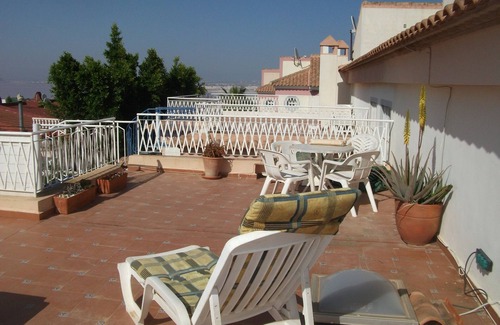 Detached 1 bedroom bungalow - comes with an exceptional large private solarium and plenty of space for outdoor dining space. This 1 bedroom holiday villa is in a small gated complex with a well kept large communal pool & gardens is in los Altos, near Torrevieja. The villa is tucked away in a sunny position ideal for sunbathing all day long privately on a sought after complex and has beautiful views of the salt lakes, swimming pool is beautiful and only a stone throw away, the complex offers well tended gardens. Ground floor open plan lounge, dining area, kitchen, one bedroom with emperor bed and mirrored wardrobes with en-suite bathroom. Front door leads to a large front sun lounge area ideal for sunbathing and alfresco dining. Stairs to side of villa take you to another large private sun lounge roof solarium - ideal for sunbathing from sunrise til sunset - there you will see the spectacular views of the salt lakes. The villa is close to all amenities, supermarkets, shops and restaurants. A bus stop for buses into Torrevieja is directly outside the complex. Final cleaning at end of your vacation is 45 euros. Air conditioning available on request an extra 3 euros per day. If you like the outdoors but like your amenities at hand this villa is ideal. What makes this villa stand out from the rest is its spacious outdoor private sunny position.