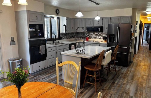 This one of a kind house features a Master bedroom with a King Sleep number bed with a private Deck and private bathroom. Two bedrooms with queen Sleep Number beds, and a forth bedroom with a King bed perfect for a group getaway. All bedrooms have TV's. There is a living room on the main floor with a fully equipped Kitchen with an island for extra space to cook or eat on and on the bottom floor is a fully equipped sports bar with poker tables, dart machine, popcorn maker and large screen TV to enjoy the football games. The home has a Fireplace and central force air heating, Choose from the 3 decks and a patio that overlooks Spring Creek with a view of the valley and Snowy Mountains. One deck has a Large Blackstone and Traegar for use while you stay. An iron and Ironing board are also provided, you'll have everything you need for a comfortable stay. The 3 bathrooms come equipped with showers and hair dryers. A great place to call homebase while you're away, we hope you enjoy your stay.