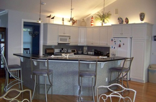 Outside, you will find a sitting area to soak in all the beautiful surroundings. Walk a little further down to the dock, and you will find a beautiful gazebo, wired with speakers to relax to your favorite tune. The private dock is perfect for catching sun rays and fishing. It's equipped with a jet ski lift and a boat slip. If you are planning to go boating, a boat ramp is conveniently located at the Bear Creek Marina, which is a short boat ride from the house. You will also find gas pumps and a Bar & Grill at the Marina. "The Lake House" also offers a concrete sidewalk down to the gazebo, and water. Easy access for a wheel chair, or stroller.