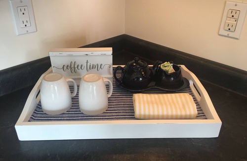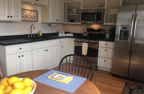 This 750 square foot 1BR/1Bath above-garage apartment has stairs that lead guests up to a screened porch which opens into a tastefully decorated kitchen w/ water view dining and living room. The kitchen is well-equipped with stainless side-by-side refrigerator w/ ice maker and water dispenser, gas 4-burner stove w/ removable griddle, as well as a microwave and coffee maker and Keurig. Dishes and utensils are provided for enjoying home cooked meals. A gas grill is available to cook up a juicy steak or burger, or you can have an old-fashioned clambake/lobster on our private beach!