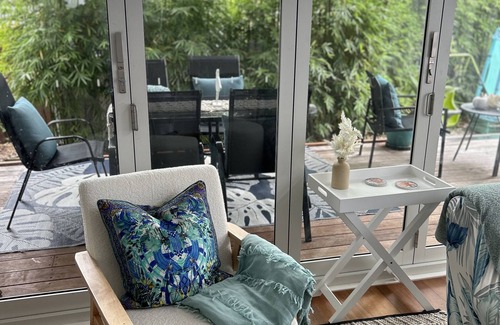 It is decorated in a Bright, Modern, Coastal vibe. Private Outdoor area.