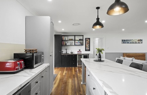 Your stay at Latitude 32 promises a relaxed and memorable experience, with amenities designed to cater to your every need. Enjoy the open-plan living area adorned with Spotted Gum floors, a wood-burning fireplace, and comfortable furnishings that encourage quality time with your loved ones. The well-equipped country kitchen features a double French door fridge, electric oven, gas cooktop, and coffee machine, making meal preparation a breeze. Outdoor gatherings are made special on the large undercover sandstone-paved patio, equipped with a wood fire pizza oven, gas BBQ, and firepit, offering an enchanting setting for your wedding festivities.