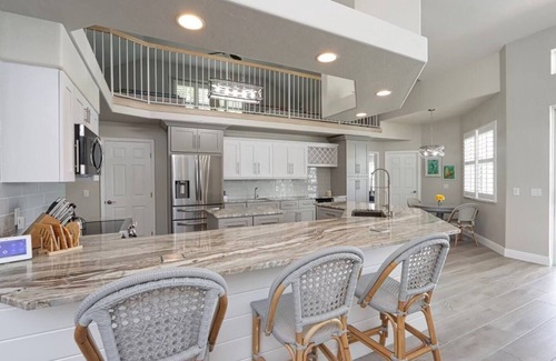 You will fall in love with “Latitude Adjustment”. This spacious house has its very own enclosed pool, tiki bar, large grill, and much more. It's located in a great central location only 11.7 miles from