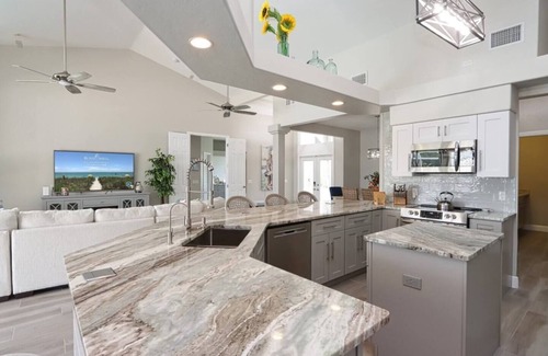 Boating, fishing, and manatee lover's welcome! This waterfront paradise is located on the Caloosahatchee River and offers direct gulf access, a private boat dock with two lifts, large, heated pool, and a waterfront tiki bar with an outside kitchen and grill. Inside, large sliding glass doors bathe your living area in natural light and immerse you in beautiful waterfront views. The perfect rental whether you want to spend a vacation on the water or just enjoy all the home’s fabulous amenities.
