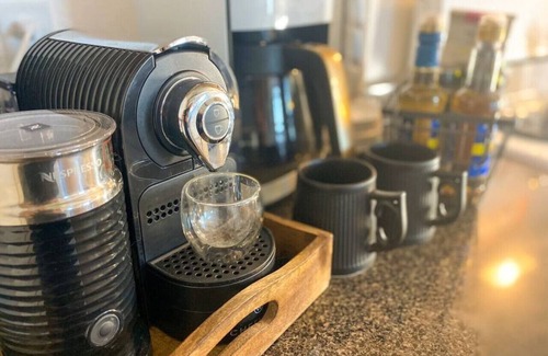 Welcome to our beautifully decorated open floor plan home, where you'll love spending time lounging on the leather couches under the wooden beams, watching your favorite shows on the 75" large screen TV with all the channels. If you're feeling creative, the fully equipped kitchen is perfect for cooking family meals, or you can head outside to the enclosed yard to grill some steaks or enjoy s'mores around the fire pit. Relax with a cup of coffee from the well-supplied Nespresso machine while sitting on the grass under the patio.