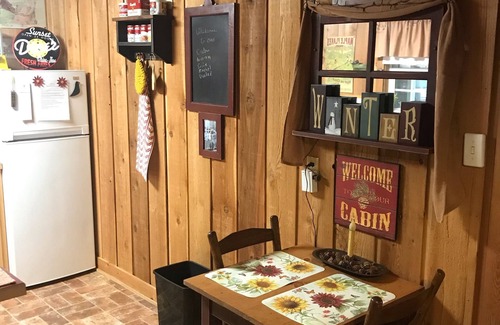 This darling cottage/cabin has a full kitchen, seating area with hand made rockers, Queen size bed, bath with shower, Satellite TV, air & heat. Charming décor! Rustic in and out with all the modern amenities. Outdoor dining area, playground and with fire pit, gas grill, picnic tables, deck and outdoor sunroom.