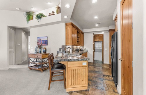Step inside to a warm and inviting interior where modern touches meet cozy charm. The living room beckons with a soft couch, armchair, and stylish accent chair arranged around a glowing fireplace, perfect for movie nights on the smart TV. The kitchen is bright and functional, equipped with both a Keurig and drip coffee maker, black appliances, and ample counter space—including seating for two—to make meal prep a joy. Share meals or plan your next adventure at the dining table for six, then head outside to the private patio, where a grill, table for four, and lounge chairs await. Grab a cocktail or a glass of wine and gaze out over the desert landscape as the sun sets behind the red rock cliffs.