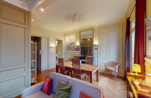 With its 3.25 m high ceilings, period moldings, decorative marble fireplace, and herringbone parquet floors, this apartment combines classic elegance with cozy comfort.