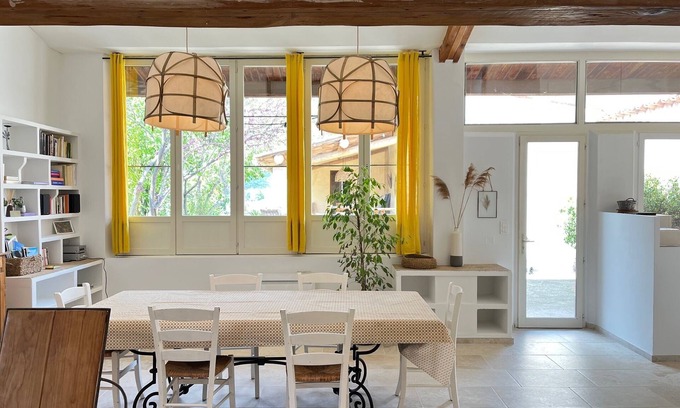 You will be able to take your meals inside in a vast air-conditioned cathedral living room very luminous with large picture windows or on the terrace (1 covered with a large teak table and 1 uncovered) and admire the sunsets on the valley of Apt or the mounts of Vaucluse, there is also a private garden of 1500 m2 with trees, barbecue, deckchairs...