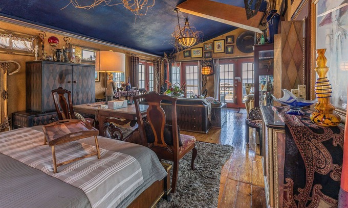 "LaView" is a truly unique, open-concept 2-story couples’ suite, and the perfect atmosphere for You & Your Special someone . The upstairs part of your Suite has a King Tempurpedic Bed with gorgeous plush linens and a 2-person Heart shaped jacuzzi/tub/shower combo overlooking the Bay. There is also a kitchenette with a small fridge, microwave and Keurig Coffee Pot and amenities as well a half bath with toilet and sink for your convenience.