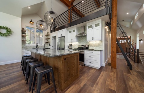 Entire home, conveniently located 10 minute walk from world famous hot springs and 5 minute walk to restaurants and breweries. Breathtaking views of Mount Hayden, Box Canyon, and Yankee Boy basin can be seen from the elevated outdoor back deck and living room. Sounds of the river are just a stone throw away, providing a soothing backdrop for evening dinners, and morning coffee. The young-at-heart will enjoy the loft area, equipped with a tournament grade foosball table and bean bags. Views of the waterfall and amphitheater can be enjoyed from the front porch Adirondack chairs and chair-lift porch swing. Property includes an enclosed one-car garage with a height of 85 inches. Also, there’s room to park an RV in the driveway or a truck and trailer perpendicular to the garage door. Additional parking for long large vehicles with trailers can be utilized in front of the home on 2nd Street. This home is centrally located in the town of Ouray and hiking trailheads are only 5 to 15 minutes away depending on which adventure you choose. The Box Canyon, via Ferrata, and Ice Park trailheads are all 20 minutes walking distance from the home. Lightning fast fiber Internet along with Hulu+ Disney+ and ESPN+ are also standard entertainment inclusions. Large-screen TVs are located in the main living area and main bedroom. The main bedroom is on the main floor with an additional three bedrooms on the downstairs garage level. Gear storage lockers provided at lower garage side door entrance. The home is equipped to host eight people comfortably. Families are welcome.