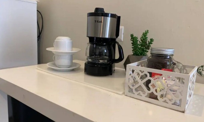 The kitchen is equipped with a refrigerator, as well as a coffee maker, a microwave, and cookware.