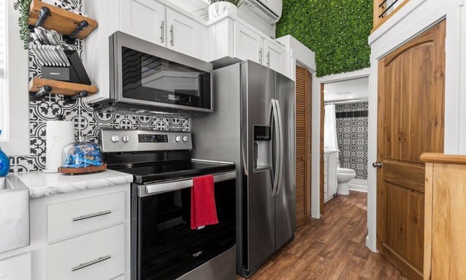 Experience luxury in this brand-new tiny home that’s bigger than you’d expect! Comfortably sleeps 5 adults on plush memory foam mattresses. Nestled on a gated 5-acre property, this private and tranquil retreat offers stunning views of a large field where deer roam each evening. One of three homes on the estate, it features a peaceful outdoor fire pit and BBQ area. Perfect for a quiet, nature-inspired getaway