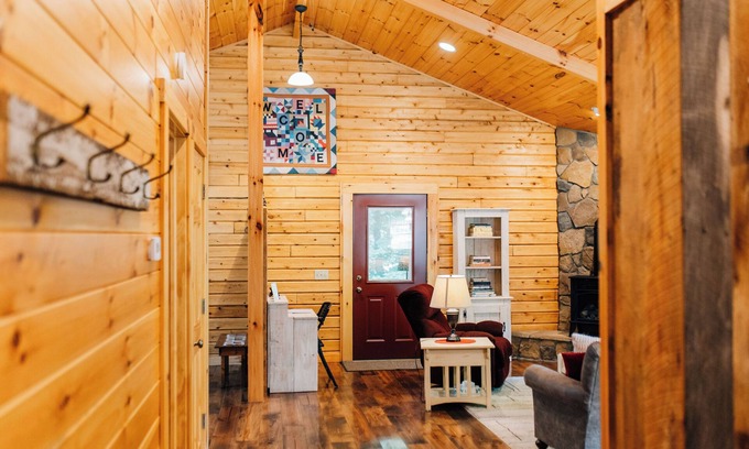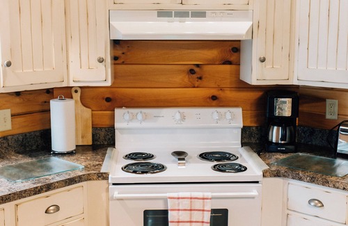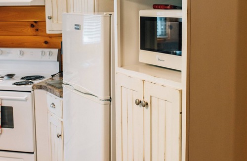 Set back into a private and serene wooded area, Lazy Days is the perfect choice if you are seeking a peaceful refuge from day-to-day life. Designed specifically with couples in mind, this cabin has one bedroom, one bathroom, a fully equipped kitchen, plenty of room to relax by the fireplace in the living area, and an enclosed back porch with a hot tub spa. Parking and unloading is convenient as you can park your vehicle directly in front of the cabin, with just a few steps to the door. The outdoor fire ring has plenty of fire wood provided, along with outdoor seating. Inside you’ll find a kitchen with a full electric range, oven, refrigerator and microwave. Along with smaller appliances such as a coffee maker and toaster. The large bathroom provides all the linens you’ll need for your stay, and the stand-up shower has an installed soap and shampoo dispenser.