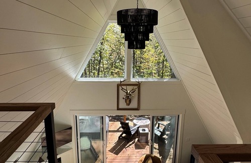 Escape to serenity in this delightful, secluded, A-frame studio cabin nestled in the enchanting Hocking Hills of Ohio. Perfectly designed for a peaceful retreat, this charming getaway comfortably sleeps up to four guests with a cozy queen bed and a versatile sleeper sofa. Also, there is a twin bed in the loft with ladder-like stairs.