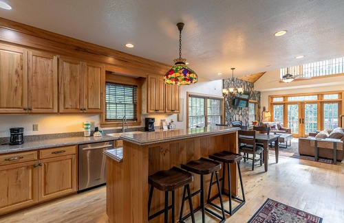 The main level includes the primary King ensuite with vaulted ceilings, a stone fireplace, an open kitchen/dining area, and a half bath. Walk up the stairs and enjoy an open loft with a shuffleboard table, extra seating, a cozy sofa, and a King bedroom with a Twin bed and a full bathroom.