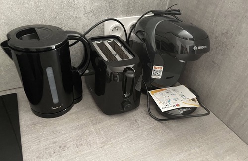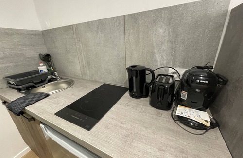 The kitchenette is equipped with a stovetop, as well as a coffee maker, an electric kettle, and cookware. Other amenities at this 1-bedroom, 1-bathroom rental include heating and a dining table.