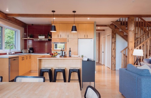 Nestled among mature trees, Chalet Le Bon Vingt is the perfect all-season escape! With the Batiscan River just 100 m away, charming wooden textures throughout, and many family-friendly features, every day brings a new adventure.