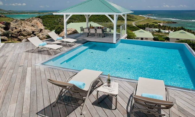Magnificent villa located on the heights of Oyster Pond, splendid 180 ° sea view, facing Saint Barth, Tintamarre and Galion beach. It is located on the French side, at the border of the border with the Dutch side.