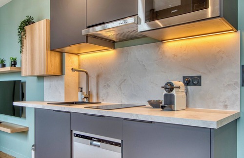 - d’une très belle cuisine toute équipée, avec un frigo, un four-micro-ondes, une plaque de cuisson deux feux, un lave vaisselle, une machine à café Nespresso, une bouilloire, un grille-pain, de vaisselles, et d’ustensiles de cuisine.